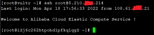 下面,有两台机器: 一台是ssh客户端机器(主机名是vultr); 一台是ssh服务端机器(主机名是iZj6c262htpobd1pfkqlqgZ,运行sshd服务)