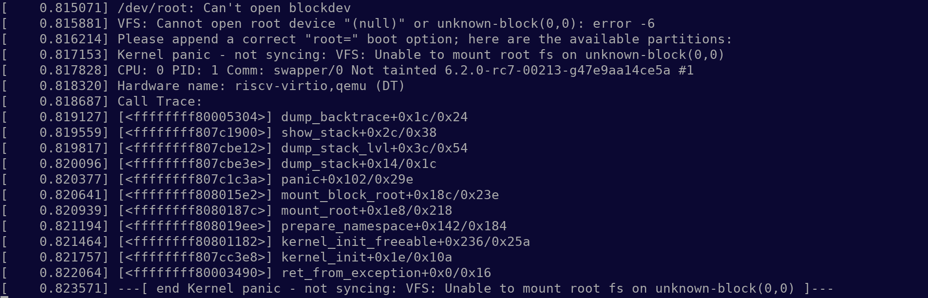 Unfortunately it ends with kernel panic because we didn’t provide a block device for a filesystem mount: